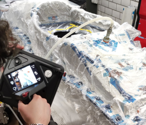 Before being equipped with Distran’s Ultra CE camera, leak search involved listening for faint leaks through human hearing and manually manipulating the vacuum bag folds to localize them, and then only patching holes or bag defects with tacky tape ; a slow and imprecise process.